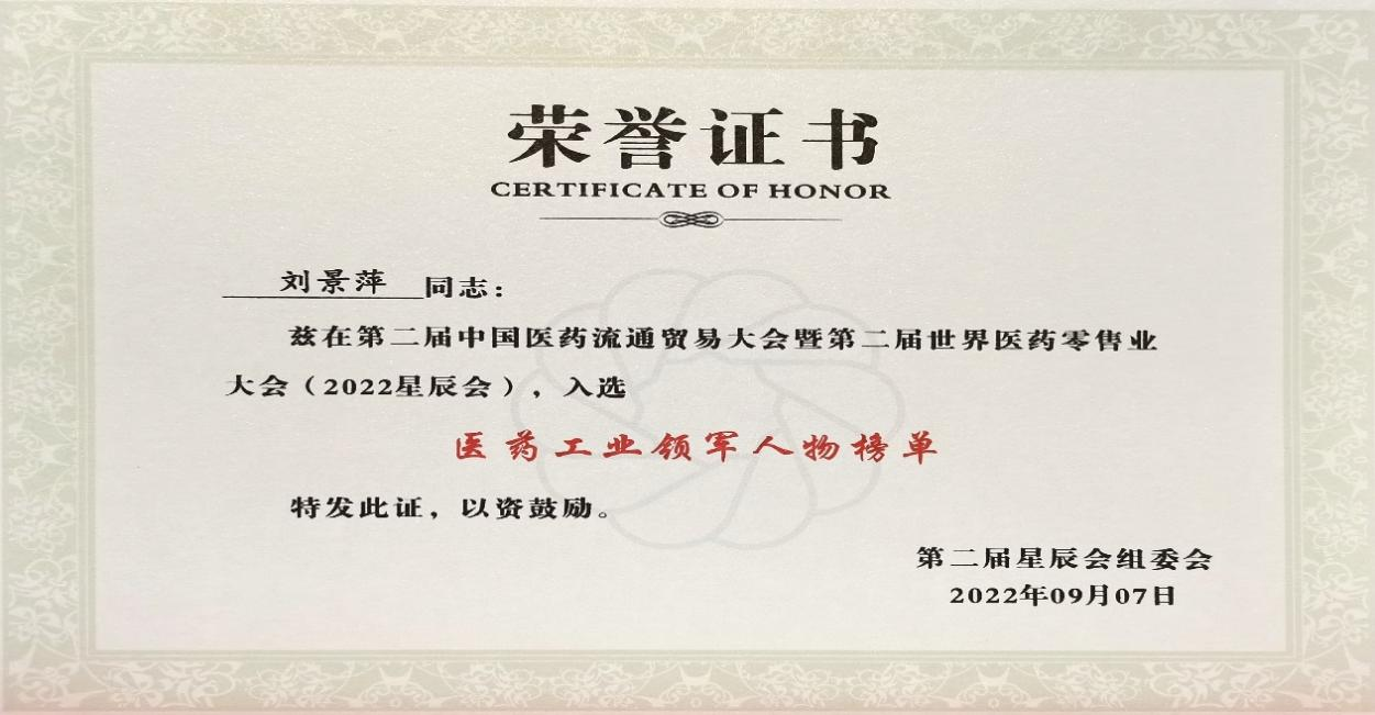在本次开幕式上,发布了“医药工业领军人物”、“医药零售领军人物”榜单,人生就是博药业集团刘景萍董事长凭借在儿药领域多年的努力探索和对行业的杰出贡献,荣获“医药工业领军人物”称号。